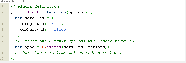讓我們先為我們的hilight插件明確一下foreground和background的顏色。我們應該能夠允許這兩個option作為option對象傳遞給plugin的主函數(shù)。例如: