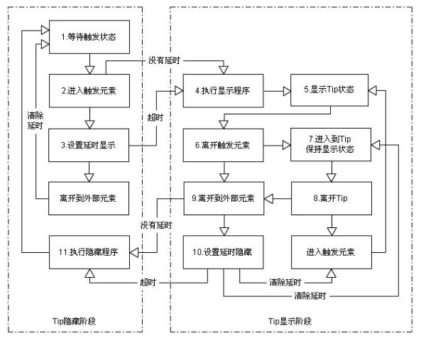 10,延時時間內(nèi),如果進入Tip,清除定時器,返回7,如果進入觸發(fā)元素,清除定時器,返回5,超過延時時間,跳到11;