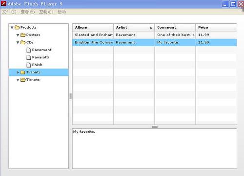 <?xml version="1.0"?> <!-- containers\layouts\HDivBoxSimple.mxml --> <mx:Application xmlns:mx="http://www.adobe.com/2006/mxml" backgroundColor="white"> <mx:Script> <![CDATA[ private function myGrid_initialize():void { myGrid.dataProvider = [ {Artist:'Pavement', Album:'Slanted and Enchanted', Price:11.99, Comment:'One of their best. 4 Stars.'}, {Artist:'Pavement', Album:'Brighten the Corners', Price:11.99, Comment:'My favorite.'} ]; } ]]> </mx:Script> <mx:HDividedBox width="100%" height="100%"> <mx:Tree id="tree1" width="30%" height="100%" labelField="@label" showRoot="true"> <mx:XMLList> <menuitem label="Products"> <menuitem label="Posters" isBranch="true"/> <menuitem label="CDs"> <menuitem label="Pavement"/> <menuitem label="Pavarotti"/> <menuitem label="Phish"/> </menuitem> <menuitem label="T-shirts" isBranch="true"/> <menuitem label="Tickets" isBranch="true"/> </menuitem> </mx:XMLList> </mx:Tree> <mx:VDividedBox width="70%" height="100%"> <mx:DataGrid id="myGrid" width="100%" height="100%" initialize="myGrid_initialize();" change="currentMessage.text= event.currentTarget.selectedItem.Comment;"/> <mx:TextArea id="currentMessage" width="100%" height="60" text="One of their best. 4 Stars."/> </mx:VDividedBox> </mx:HDividedBox> </mx:Application>