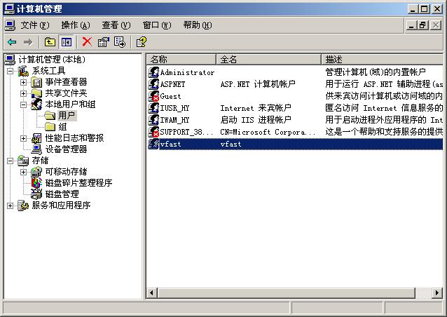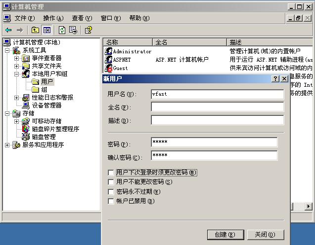 6)FTP站點建立完成后需要到計算機管理中添加新用戶。這里我建立的是Vfast