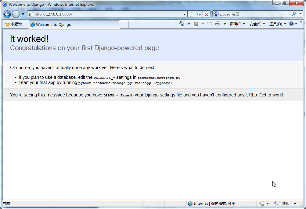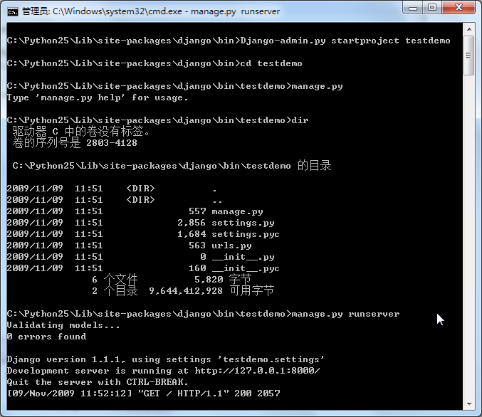 運行manage.py runserver 后,在瀏覽器地址欄中輸入http://127.0.0.1:8000/