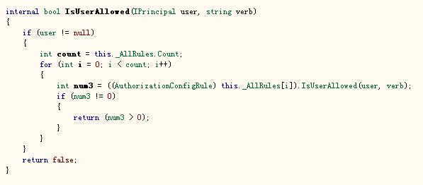 UrlAuthorizationModule在應(yīng)用程序初始化時(shí)向HttpApplication::AuthorizeRequest事件(安全模塊已驗(yàn)證用戶(hù)授權(quán)時(shí)發(fā)生)注冊(cè)委托代碼,該代碼內(nèi)部調(diào)用AuthorizationConfig::IsUserAllowed.方法實(shí)現(xiàn)截圖如下: