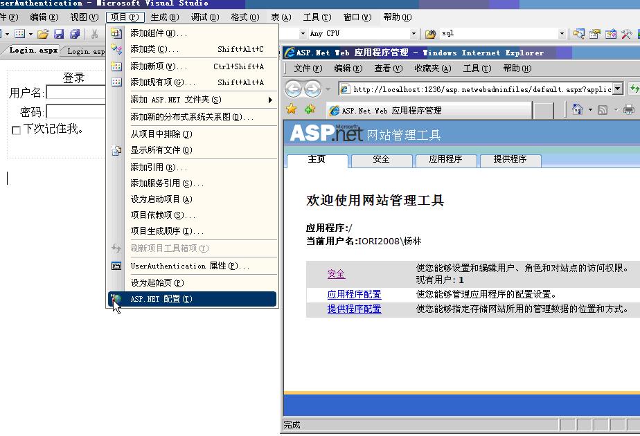 使用VS2008自帶的配置工具設(shè)定成員與角色是最簡(jiǎn)單不過(guò)的了,點(diǎn)擊菜單欄中的[項(xiàng)目],下拉菜單的最后一項(xiàng)[ASP.NET配置],在彈出窗體中設(shè)置成員與角色關(guān)系.如下圖展示: