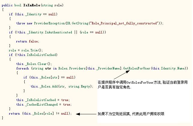 而IsUserAllowed方法最終會(huì)調(diào)用RolePrincipal對(duì)角的IsInRole方法來(lái)判斷當(dāng)前用戶(hù)是否擁有某角色,方法截圖如下: