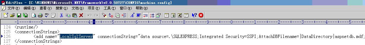 另外該工具還會(huì)自動(dòng)創(chuàng)建本地?cái)?shù)據(jù)庫(kù)(如果還沒(méi)創(chuàng)建).與它相關(guān)的配置在machine.config文件中指定,如下圖所示,你可以更改數(shù)據(jù)庫(kù)的文件名,默認(rèn)為”aspnetdb.mdf”.