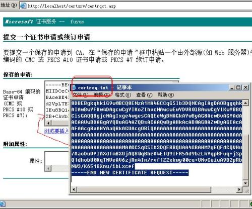 還記得之前讓記住的TXT地址吧,如果名字沒改過的話就是certreq.txt,打開它,復(fù)制里面的文字放進(jìn)網(wǎng)頁的文本框中確定