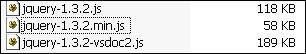 有了智能感知我們編寫javascript變得和C#一樣快速,便捷,舒服.大部分情況可以一次編寫成功而不用再為了一個(gè)大小寫而查詢javascript幫助文件.能夠讓Visual Studio對(duì)jQuery實(shí)現(xiàn)智能感知的前提是要引入vsdoc版本的jQuery類庫(kù). 示例中我們引入了"jquery-1.3.2-vsdoc2.js"文件. 如果引用其他版本比如min版本的jQuery類庫(kù)就無法啟用智能提示.但是在正式環(huán)境下, 我們必須要使用"min"版本的jquery庫(kù)文件, 以1.3.2版本號(hào)為例,各個(gè)版本的大小如下:
