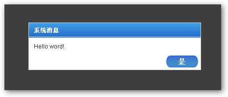 代碼很簡單吧?是不是找到了MessageBox中的感覺?但這個方法你無法控制標(biāo)題的內(nèi)容(其實可以通過改變配置參數(shù)來改變標(biāo)題)和“是”那個按鈕的動作,點擊它就只是關(guān)閉窗口。