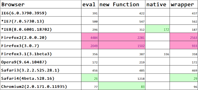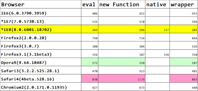根據(jù)Oliver的描述,他猜測是由于Safari4和Chrome緩存了eval的結(jié)果從而導(dǎo)致它們的測試成績“虛”高,測試結(jié)果證明了他的推測: