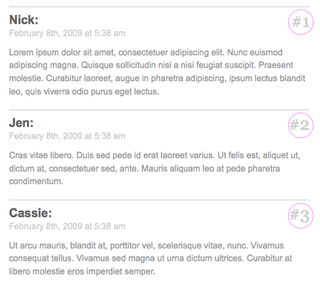 樣式化<li>:position:relative 用position:absolute把.commentnumber放在留言條目的右上角。