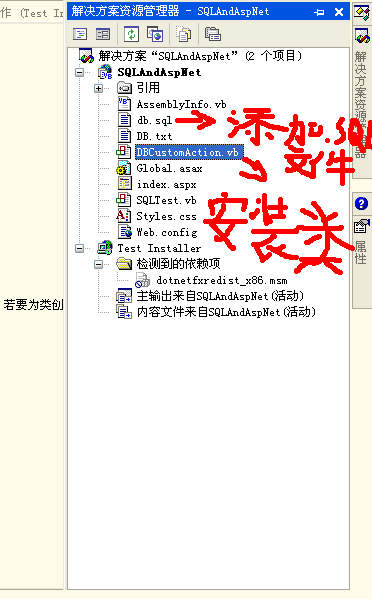 三。將 VbNetTest項目的輸出添加到部署項目中(假如你的虛擬目錄是SQLANDASPNet)
