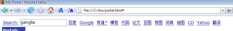 這個頁面是為了方便自己同時使用多種搜索引擎(呵呵我用其作默認主頁),在IE5/IE6/FireFox下均運行正常,效果如下圖