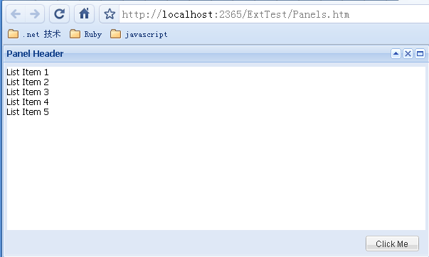 最后介紹通過(guò)items配置項(xiàng)向Panel內(nèi)添加其他Extjs組件的方法。Panel內(nèi)除了直接添加html之外還可以添加其他的組件,Panel本身也是組件,所以Panel是可以嵌套的。嵌套的Panel結(jié)合下一節(jié)要介紹的布局可以方便的完成一些布局工作。