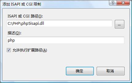 6、在“ISAPI和CGI限制”里點(diǎn)右鍵“添加”,路徑還是選成c:\php\php5isapi.dll,描述還寫(xiě)成php,選中“允許執(zhí)行擴(kuò)展路徑”。