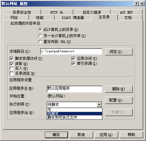解決方法是將IIS應(yīng)用程序設(shè)置中的執(zhí)行權(quán)限更改為“無(wú)”或“純腳本“。