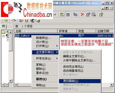 10:在企業(yè)管理器中右擊 f_fulltext 表,如 圖10 所示,選中“更改跟蹤”。