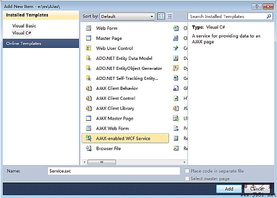 1. 建立一個網(wǎng)站,并在其中添加一個WCF服務(這里一定要選擇Ajax-Enabled WCF Service),如下圖所示: