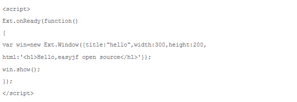 var win = new Ext.Window({ title: "Hello", width: 300, height: 200, html: '<h1>Hello Easy ExtJS Open Source Window</h1>' });