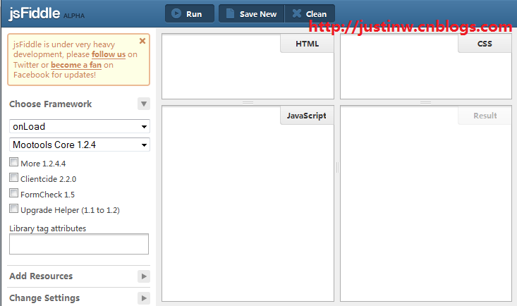 很強大的JS在線調(diào)試工具,支持多種應(yīng)用多種主流框架,可以在線直接編輯調(diào)試:HTML、CSS、JavaScript,用起來非常方便,而且還可以將調(diào)試好的結(jié)果以非常簡潔的頁面直接嵌入在其他網(wǎng)頁里,這樣我需要寫演示用的JavaScript實例代碼的時候,就完全可以在jsFiddle里面直接完成編寫后調(diào)試,再將結(jié)果直接嵌入Blog正文里即可了,真的是很方便的選擇,如下所示(這個例子只能在Firefox里查看Result效果)。