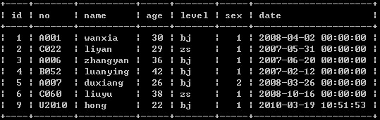 (3,'A006','zhangyan',36,'hj',1,'2007-06-20 00:00:00'),