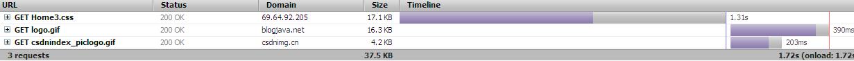 阻塞下載圖:下圖是訪問blogjava首頁的時間瀑布圖,可以看出來開始的2個image都是并行下載的,而后面的2個JS都是阻塞下載的(1個1個下載)。