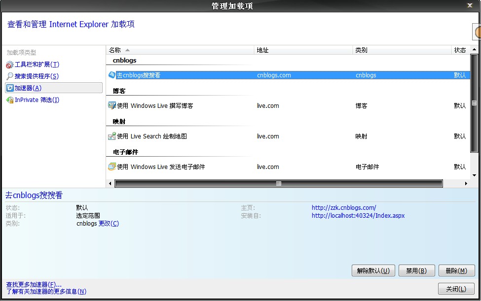 在IE8中右擊-->所有加速器-->管理加速器即可以對(duì)現(xiàn)有的加速器進(jìn)行管理,如下