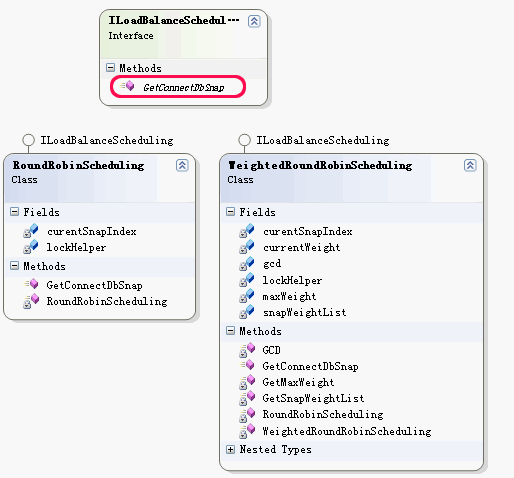 它就是負(fù)載均衡算法的實現(xiàn)接口,為了便于說明在Discuz.EntLib中內(nèi)置的兩個負(fù)載均衡算法的實現(xiàn)情況,請先看下圖: