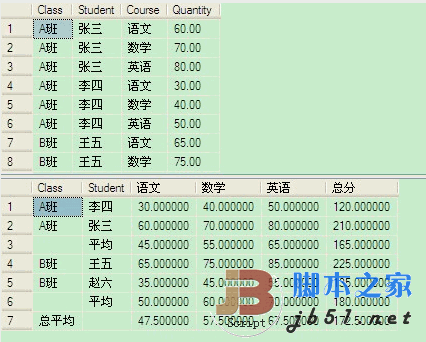 一句Sql把縱向表轉(zhuǎn)為橫向表,并分別分組求平均和總平均值,需要的朋友可以參考下。