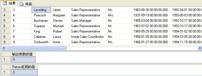 可以看出是通過EXEC @return_value = [dbo].[Employee] @Rowcount = @MyOutput OUTPUT中的return_value變量來獲得返回值,而用MyOutput變量來獲得了輸出變量值,此處的MyOutput變量相當于引用傳遞!