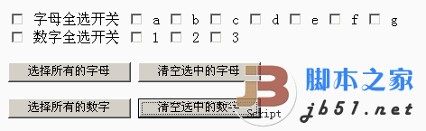 <input type="button" value="選擇所有的字母" onclick="checkAll('test')" /> <input type="button" value="清空選中的字母" onclick="clearAll('test')" /> <br />