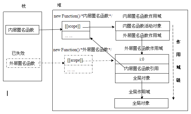 根據Scope Chain的理解可以解釋,返回的內嵌函數(shù)已經持有了構造它時的Scope Chain,雖然outer返回導致這些對象超出了作用域、生存期范圍,但JavaScript使用自動垃圾回收來釋放對象內存: 按照規(guī)則定期檢查,對象沒有任何引用才被釋放。因此上面的代碼能夠正確運行。
