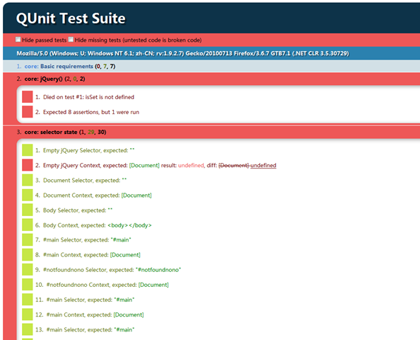 QUnit不僅僅為你提供了測試腳本函數(shù),還為你的單元測試提供了一個標準化的測試界面,如下圖所示,紅色的表示這個測試用例沒有通過,綠色的表示通過。每一個框比表示一個測試函數(shù),里面可能有多個斷言語句的結(jié)果,標題中(x,y,z)表示總共有z個斷言,y個是正確的,x個是錯誤的。