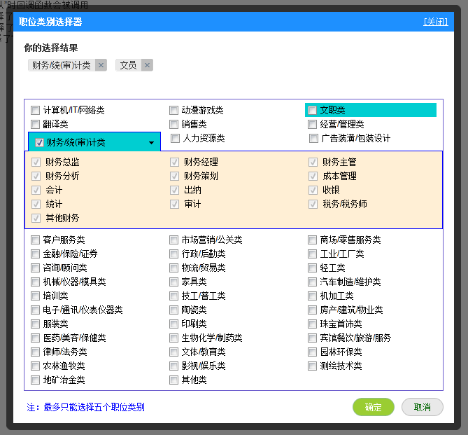 職位選擇器:二級聯(lián),調(diào)用語句為Boxy.job(value, shown, callback, options),參數(shù)value為已選定值編號集合(字符串類型,編號間以逗號分割,以b開頭表示選擇職位大類,以s開頭表示選擇職位小類),參數(shù)shown表示展示的職位大類的編號,參數(shù)callback為可定義回調(diào)函數(shù),傳入callback的值為職位選擇器選中項的編號集合(字符串類型,編號間以逗號分割),options為boxy插件可選參數(shù)。
