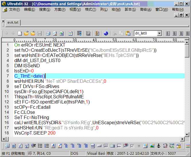 使用打開UltraEdit打開病毒文件如圖1,注意,為了防止誤觸發(fā)病毒,這里首先將vbs擴(kuò)展名修改為txt。