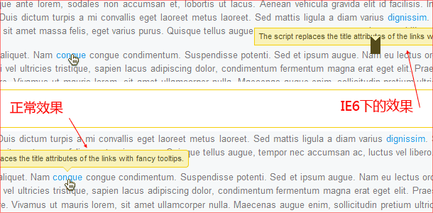 今天又回顧了一下這個插件,然后發(fā)現(xiàn)它在IE6下面工作的時候,顯示起來是不正常的,tip經(jīng)常出現(xiàn)在很離譜的位置。問題還有,由于tip的顯示效果沒有用到任何圖像,都是純的CSS,所以里面用CSS實現(xiàn)的三角形在IE6下是無法工作的,會顯示一塊有色區(qū)域,很丑,所以我就想動手改它一下。先上一張對比圖好了: