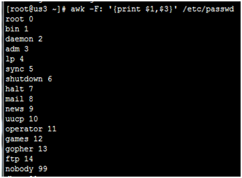 awk –F: ‘{print $1,$3}'/etc/passwd
