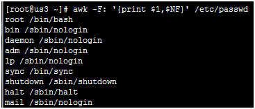 awk –F: ‘{print $1,$NF}'/etc/passwd