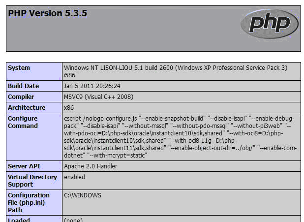 保存退出,此時(shí)apache+mysql+php5的運(yùn)行環(huán)境就搭建完畢,你可以在測(cè)試目錄中新建一個(gè)文件phpinfo.php,其中寫入:<?php phpinfo(); ?>,然后通過http://localhost:8080/phpinfo.php進(jìn)行訪問。如果成功的話,將出現(xiàn)如下圖的頁(yè)面: