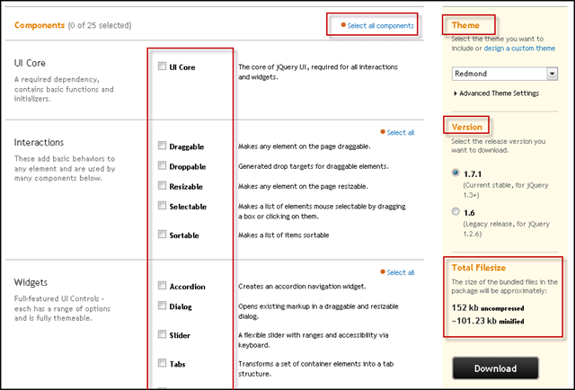 jQuery UI 的在線網(wǎng)站十分強(qiáng)大. 首先就是在下載時(shí)可以組裝自己想要的功能定制下載: