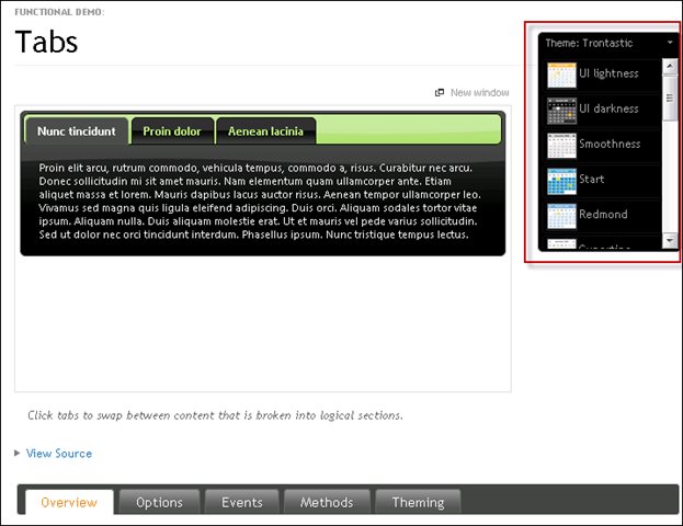 本實(shí)例通過(guò)jQuery UI的Tabs組件實(shí)現(xiàn). Tabs組件的使用與dialog一樣十分簡(jiǎn)單, 默認(rèn)的配置即可實(shí)現(xiàn)最簡(jiǎn)單的tab, 通過(guò)設(shè)置更多的options可以實(shí)現(xiàn)更復(fù)雜的應(yīng)用.