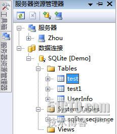 這時候選擇System.Data.SQLite使用的數(shù)據(jù)庫文件,文件后綴默認(rèn)是.db3,還可以點擊下方的“測試連接”按鈕,如果沒有問題就會彈出正確的對話框,點擊“確定”按鈕之后在服務(wù)器資源管理器中就會出現(xiàn)如下的情況: