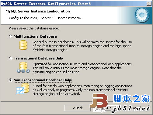 選擇MySQL數(shù)據(jù)庫(kù)默認(rèn)存儲(chǔ)方式:Non-Trans Only (MYISAM)