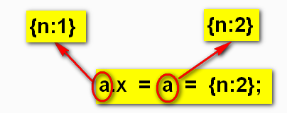 a.x 中的a指向的是 {n:1},a 指向的是 {n:2}。如下圖