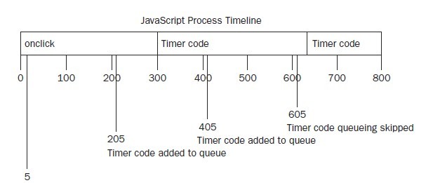 比如onclick要300ms執(zhí)行完, block1代碼執(zhí)行完, 在5ms時(shí)執(zhí)行setInterval, 以此為一個(gè)時(shí)間點(diǎn), 在205ms時(shí)插入process代碼, click代碼順利結(jié)束, process代碼開(kāi)始執(zhí)行(相當(dāng)于圖中的timer code), 然而process代碼也執(zhí)行了一個(gè)比較長(zhǎng)的時(shí)間, 超過(guò)了接下來(lái)一個(gè)插入時(shí)間點(diǎn)405ms, 這樣代碼隊(duì)列后又插入了一份process代碼, process繼續(xù)執(zhí)行著, 而且超過(guò)了605ms這個(gè)插入時(shí)間點(diǎn), 下面問(wèn)題來(lái), 可能你還會(huì)認(rèn)為代碼隊(duì)列后面又會(huì)繼續(xù)插入一份process代碼...真實(shí)的情況是,由于代碼隊(duì)列中已經(jīng)有了一份未執(zhí)行的process代碼, 所以605ms這個(gè)插入時(shí)間點(diǎn)將會(huì)被"無(wú)情"的跳過(guò), 因?yàn)閖s引擎只允許有一份未執(zhí)行的process代碼, 說(shuō)到這里不知道您是不是會(huì)豁然開(kāi)朗呢...