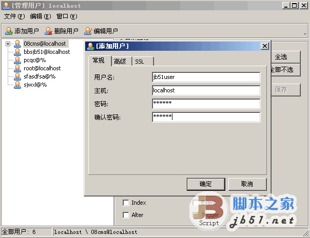 第五步:新建用戶后,點擊展開就能看到多個數(shù)據(jù)庫,可以選擇我們上面創(chuàng)建的數(shù)據(jù)庫jb51,這里以bbsjb51為例子,主要是看數(shù)據(jù)庫特殊許可權(quán),一般全選即可,如果為了安全,可以更細(xì)的設(shè)置權(quán)限。例如:只給select。