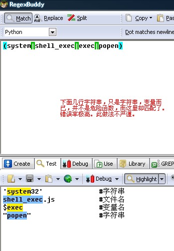 再看看下一個列表的第一個元素?!?system|shell_exec|exec|popen)】,這個正則的意思是只要字符串里包含“system”、“shell_exec”、“exec”、“popen”這四組字符串即判定為危險字符。很明顯,這個方法太不嚴謹。如果程序員寫的代碼中,包含了這四組字符,即可被判定為危險函數(shù)。很不準確,誤報率極高。見下圖