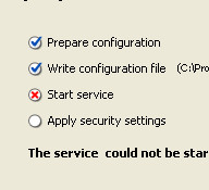 糾結(jié)了挺久,也忘了是看到什么文章觸發(fā)了靈感,反正后來才知道原來是數(shù)據(jù)引擎不同惹的禍。于是就想到重新運(yùn)行次設(shè)置向?qū)В褦?shù)據(jù)庫(kù)類型改成支持InnoDB引擎的。馬上行動(dòng),在向?qū)Ю镌O(shè)置數(shù)據(jù)庫(kù)類型(也就是圖1的database usage)那里,設(shè)置成第二項(xiàng),還在后面的InnoDB Tablespace Settings里把InnoDB數(shù)據(jù)文件設(shè)置放在D:\MySQL InnoDB Datafiles目錄里。但是在最后execute執(zhí)行的時(shí)候,卻老是在Start Service那里出問題,如下圖2。