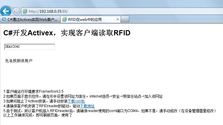 這里的RFID使用的是MasterRD.dll和CFCom.dll不同產(chǎn)品使用可能不同,同時(shí)注意RFID的COM端口號(hào),本例為測試?yán)?,所以寫死了COM口,客戶端IE瀏覽時(shí),需要將RFID的端口改成對(duì)應(yīng)的。