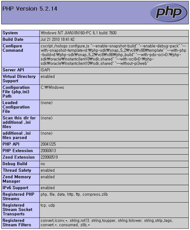 1.首先下載PHP,這里我下載的是php5.2.14(如果是其他高版本的話可能找不到php5isapi.dll,其相關(guān)配置方法暫且不論),建議下載zip壓縮包,不需安裝就可以了,并且下載時請注意用選擇VC9的包而不是VC6(這個是apache用的)。例如我解壓到d:\ php-5.2.14-Win32。