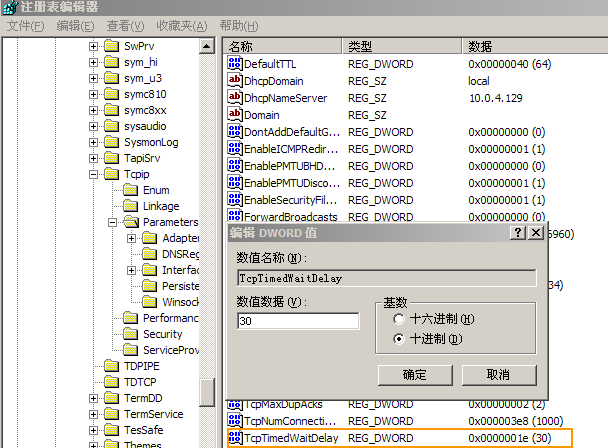 4)如果在刷新后偶爾能夠正常顯示而且服務(wù)器是Windows系統(tǒng)的話,那么減小Windows中TcpTimedWaitDelay時(shí)間可解決此類問題,默認(rèn)情況下為240(未設(shè)置的情況下也是這個(gè)數(shù)值)此項(xiàng)設(shè)置需要到注冊(cè)表如下位置進(jìn)行設(shè)置HKEY_LOCAL_MACHINE\SYSTEM\CurrentControlSet\Services\Tcpip\Parameters\TcpTimedWaitDelay 如果注冊(cè)表中沒有TcpTimedWaitDelay這個(gè)項(xiàng)目,請(qǐng)?jiān)黾舆@個(gè)項(xiàng)目,并設(shè)置為雙字節(jié)(DWORD)類型數(shù)值設(shè)置為30 ~ 60 之間即可